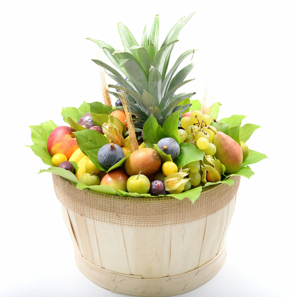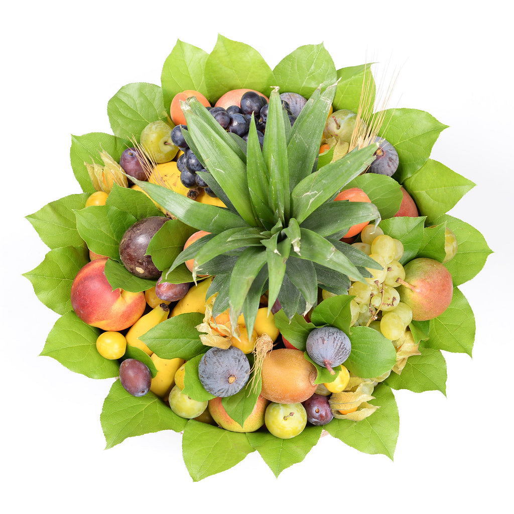 Ananas avion, mangue avion, fruit de la passion, kiwi, raisin de table, prunes, figues fraîches, bananes, poires, pommes, physalis.